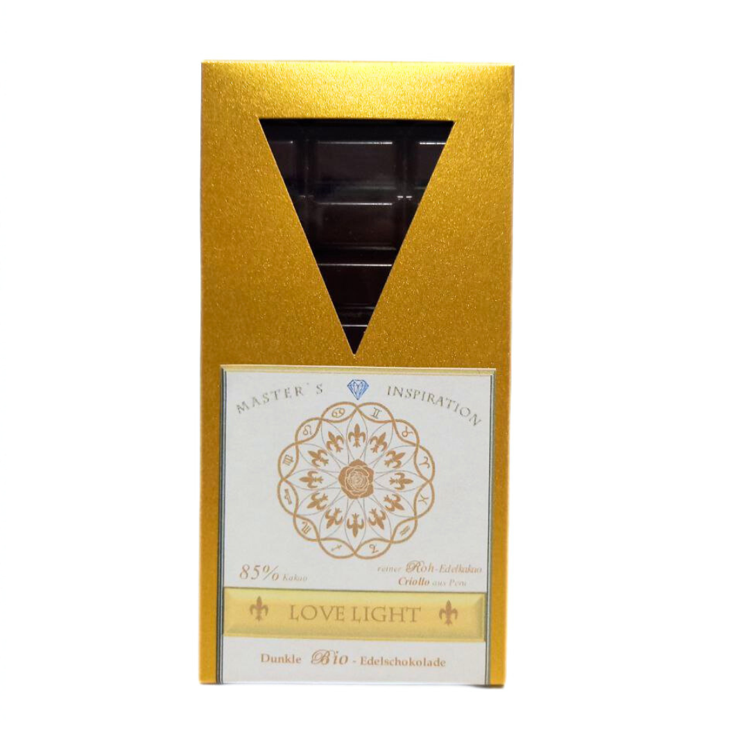 Die Lovelight-Schokolade mit 85% Kakao bringt die unvergleichliche Eigenschaft des Lichtspeicherns unseres natürlichen Bio-Rohkakao Criollo ganz besonders gut zum Vorschein. Unsere einzigartige Art der Herstellung dieser Schokolade führt zu einer herausragenden Qualität.
