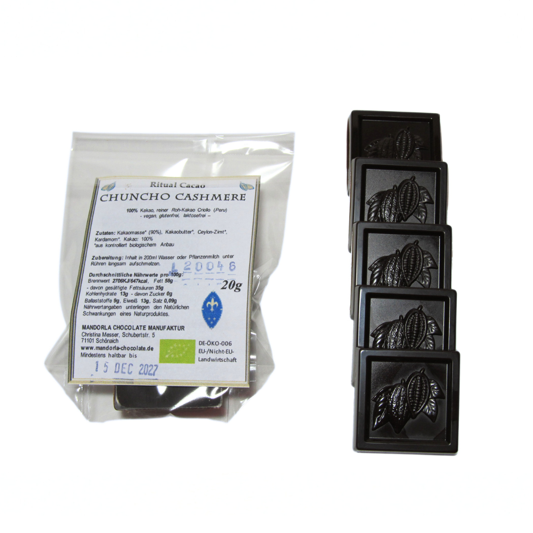 Mit seiner traditionellen Gewürzkombination bindet sich unser Ritual Cacao Chuncho Cashmere mit 100% Kakao, Ceylon-Zimt, Kardamom und Chili an die indische Kakaotradition an.